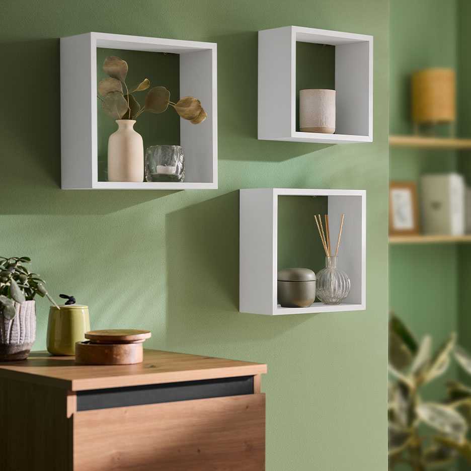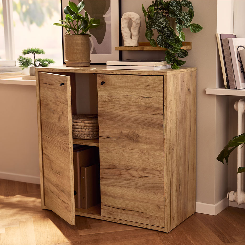 Ниските шкафове или скриновете със затворени предни страни създават усещане за спокойствие – независимо дали зад вратите цари безпорядък. Ако обичаш отворените рафтове, просто прибери дребните предмети в красиви кутии и кошници за съхранение с текстилна облицовка.